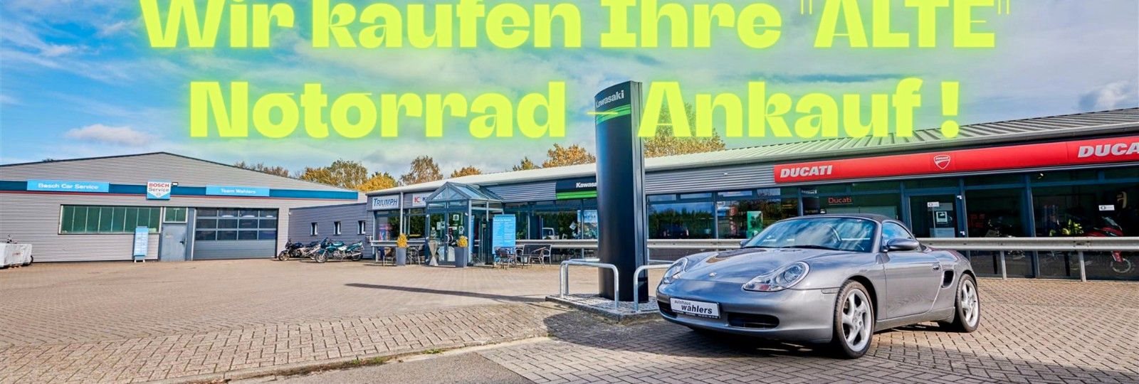 Team Wahlers GmbH - Ihr einziger KAWASAKI & DUCATI-Vertragshändler & TRIUMPH-Motorrad Service & KYMCO-Vertragshändler & BOSCH Car-Service in Scheeßel Mitte Hamburg-Bremen an der B 75 am Rande der Lüneburger Heide.